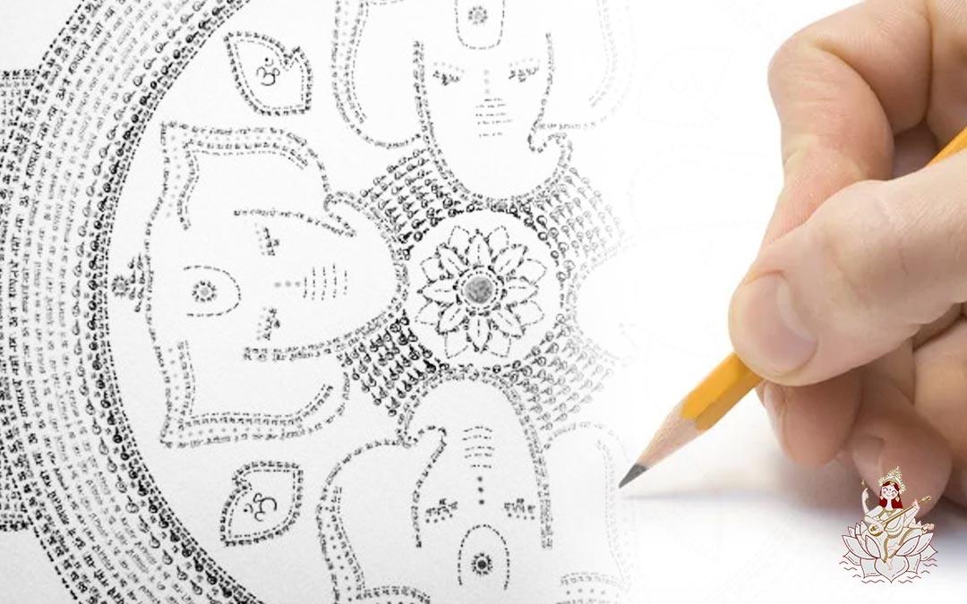 J’ai rencontré des sadhakas pour qui la pratique du likhita japa était en même temps en pratique artistique. Moins formelle que dans des cases ou des lignes, leur écriture se dessinait dans l’espace donnant par exemple forme à des mandalas ou s’inscrivant dans la forme de la divinité désignée par le mantra. Comme une mosaïque où chaque pièce est un élément à part entière mais avec la prise de recul, l’image d’ensemble se dessine avec magnificence. Inconscient de la perspective, intuitivement leur main était guidée pour que se dessine une image globale d’un tout autre registre.